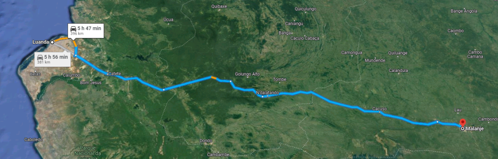 The Macon coach company has daily four departures to Malanje calling from Luanda city. The quickest journey by Macon takes about 8 hours to Malanje. https://www.webrodoviaria.com.br/VendaWebMacon/consulta. By personal car, count 5-6 hours for the same journey.
